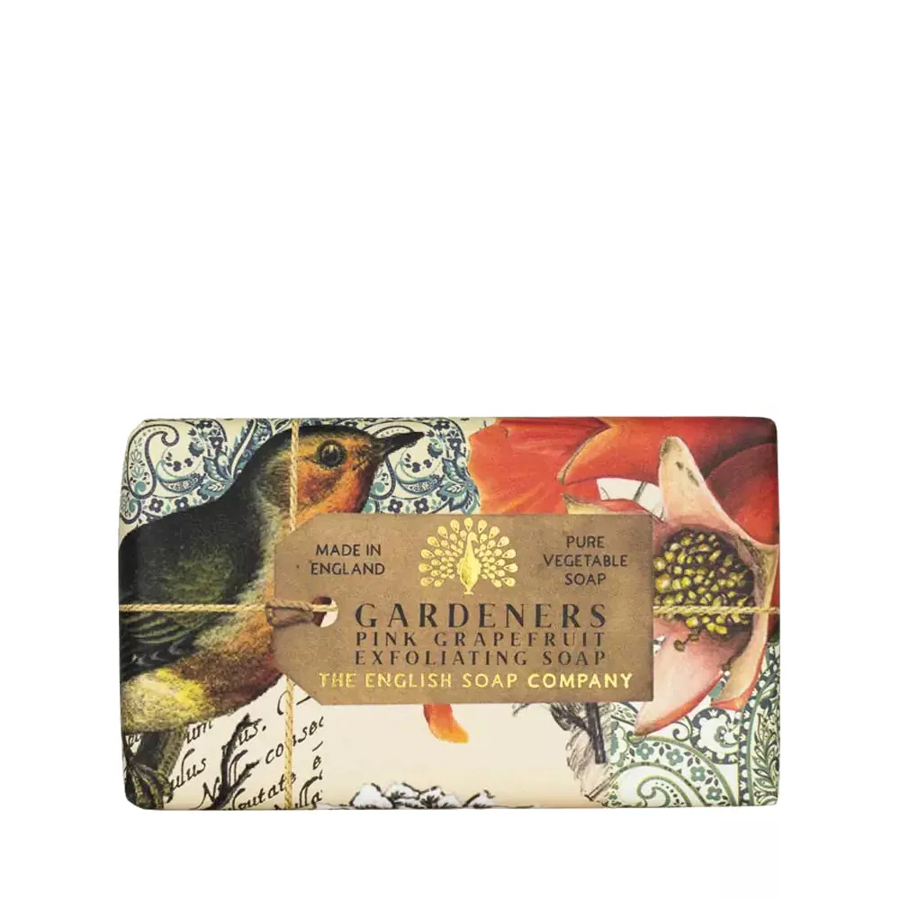 Gardeners Grapefruit Exfoliating soap bar, from the Anniversary Collection. A moisturising shea butter soap generously perfumed with the enlivening scent of pink grapefruit and peach. Ground walnut shell exfoliates the skin and scrubs away dirt after a day’s gardening. Wrapped in beautifully illustrated, fully recyclable packaging.
