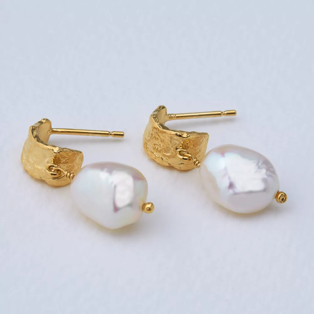 Elevate your jewellery collection with the Pearl & Bark huggie hoop earrings. Organic freshwater pearls dangle gracefully from etched bark huggie hoops, creating a refined and elegant look.