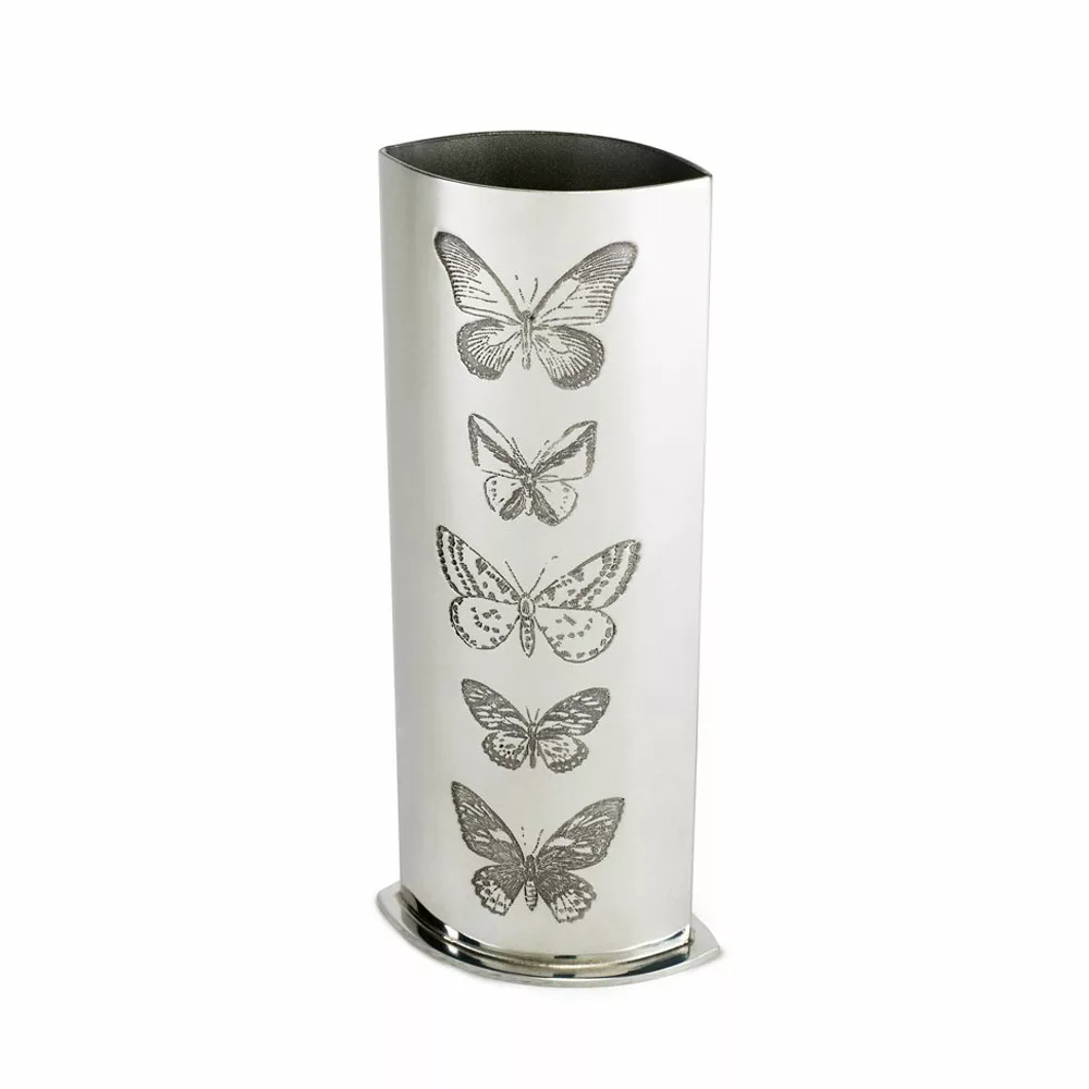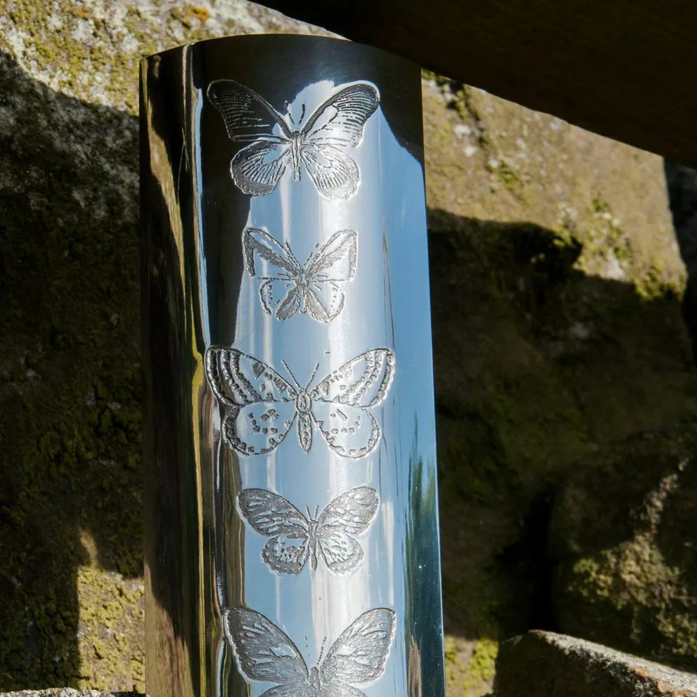 Pewter small bud vase embossed with butterfly pattern. Its compact size makes it perfect for showcasing a single bloom or a small bouquet. The subtle lustre of the pewter complements both classic and contemporary décor.