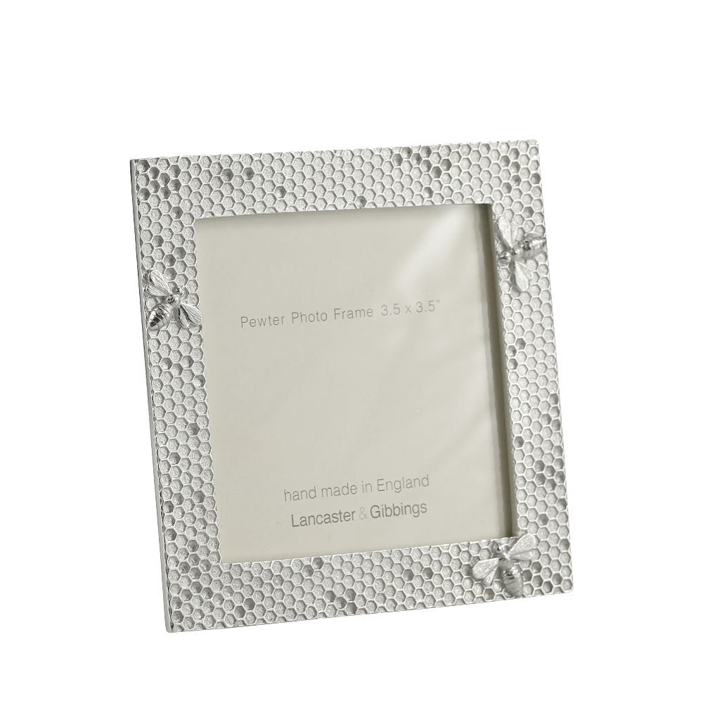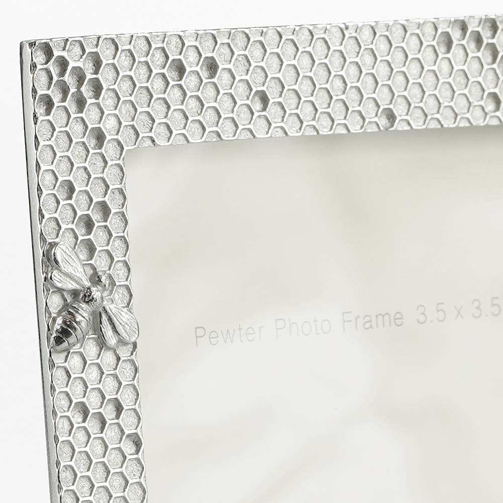 The Honeycomb pewter picture frame is made from cast pewter and handmade in England. It is adorned with a delicate honeycomb pattern that catches and reflects the light, giving it a soft, luminous finish. Nestled within the design are three finely detailed bees. This elegant photo frame is a beautiful way to display your most treasured memories.