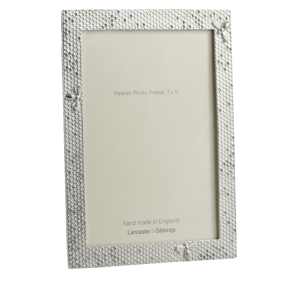The Honeycomb pewter picture frame is made from cast pewter and handmade in England. It is adorned with a delicate honeycomb pattern that catches and reflects the light, giving it a soft, luminous finish. Nestled within the design are three finely detailed bees. This elegant photo frame is a beautiful way to display your most treasured memories.