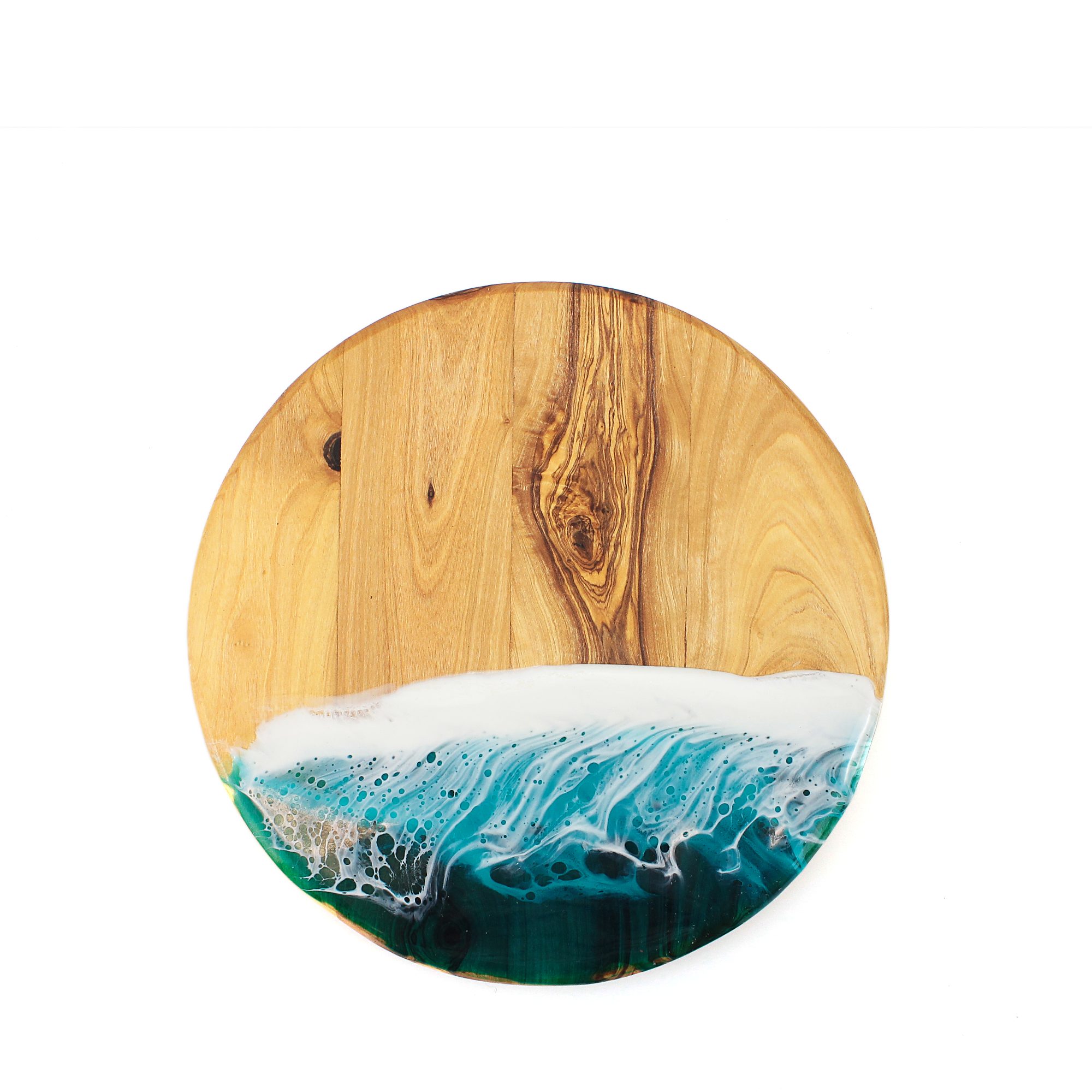 The British Emporium Resin Pizza Board crafted from real wood and adorned with a stunning ocean wave resin design. It features a wave design that beautifully mimics the gentle ebb and flow of the sea, just as the waves are rolling onto the shore. The warmth of the wooden board contrasts perfectly with the vibrant sea resin colours. Ideal for serving up delicious pizzas or as a unique serving platter.