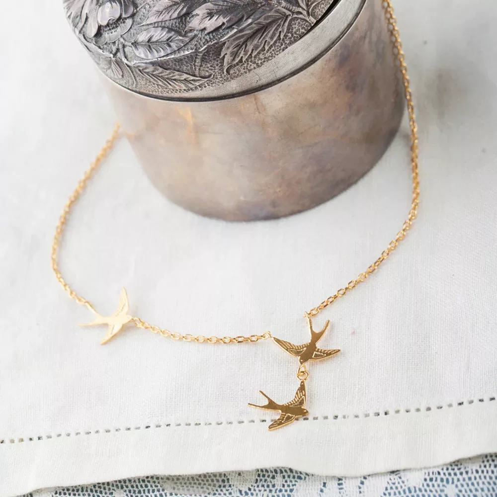 This is a swallows necklace featuring three flying swallows, handmade in the UK. Swallows are well known for huge migrations across continents and are thought to be one of the early signs of Spring. These birds are excellent flyers, soaring effortlessly across the sky, darting this way and that, catching little insects for their tea as they go. This necklace would make a perfect gift for a free spirit or traveller for which the swallow is a symbol. The swallow necklace is also a beautiful gift for a family of three or a new mother, with each of the birds representing a family member.